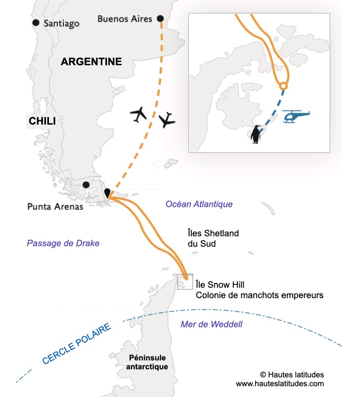 ☞ Intérêts de ce voyage : manchots empereurs, banquise, iceberg, glacier, paysage, vol en hélicoptère…